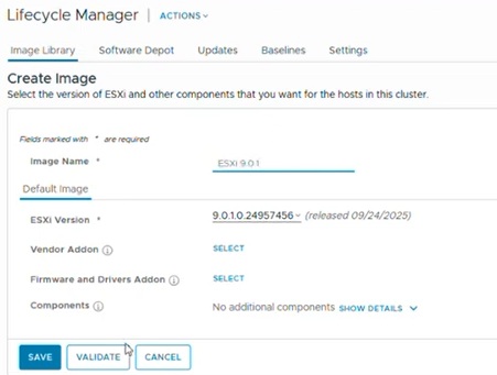 Once imported, click CREATE IMAGE, and under Default Image, chose the newly imported ESXi version.
